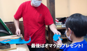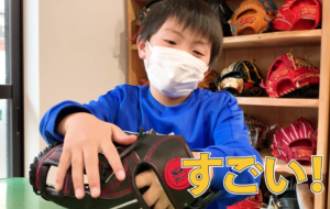 出来上がったグローブを早速手にはめます。野球博士もご満悦の様子です笑