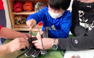 プロによるチェックも入ることで、紐通し体験でありながら室の高いグローブに仕上がっていくのグローブの本場三宅町ならではです!