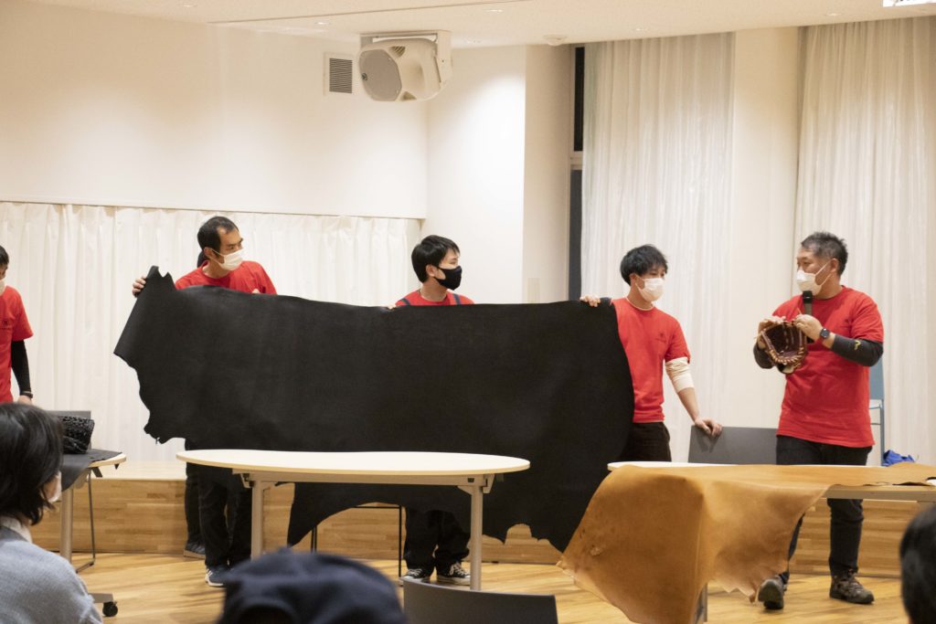 三宅町のグローブ職人をはじめ、大阪府の靴メーカー「インターナショナルシューズ」の上田さん、神戸市の革小物メーカー「STUDIO KIICHI」の片山さん、山梨県の甲州印伝「印伝の山本」の山本さんと普段それぞれが扱う革のお話からモノづくりの視点を交差しながらこれからの三宅町のグローブづくりへの新たな発見やヒントが見えてきました。